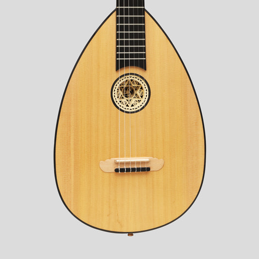 La guitarra laúd germánica tiene su origen en Alemania y se asocia con tocar junto al fuego. Su tamaño práctico, similar al de una guitarra, y su cuerpo con forma de laúd se transportan fácilmente y, con su cuenco de sonido grande y curvo, amplifica muy bien el instrumento.